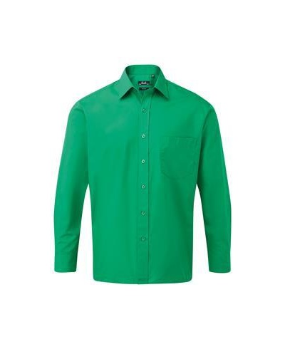 Ein langärmliges Popeline-Hemd für Herren, erhältlich in 27 Farben. Dieses klassische Arbeitshemd hat einen versteiften, formellen Kragen und eine offene Gehrungstasche auf der linken Brust. Der langärmlige Stil hat geknöpfte Manschetten,