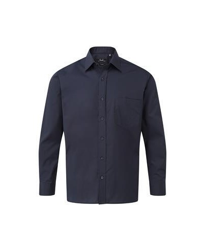 Ein langärmliges Popeline-Hemd für Herren, erhältlich in 27 Farben. Dieses klassische Arbeitshemd hat einen versteiften, formellen Kragen und eine offene Gehrungstasche auf der linken Brust. Der langärmlige Stil hat geknöpfte Manschetten,