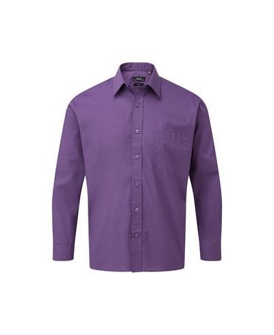 Ein langärmliges Popeline-Hemd für Herren, erhältlich in 27 Farben. Dieses klassische Arbeitshemd hat einen versteiften, formellen Kragen und eine offene Gehrungstasche auf der linken Brust. Der langärmlige Stil hat geknöpfte Manschetten,