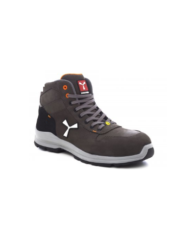Mittelhoher Herren-Sicherheitsschuh, Obermaterial aus wasserabweisendem und atmungsaktivem Leder, atmungsaktives und abriebfestes Innenfutter (auf der gesamten Innenfläche), 8+8 metallfreie Ösen, Hinterkappe aus Leder mit Pampasstruktur mit reflektierendem Einsatz, Zehenschutzkappe aus druckgegossenem Aluminium, herausnehmbare Einlage Ortholite X40 016 ESD, zertifizierte durchtrittsichere Sohle aus Verbundgewebe, Versteifungselement zum Schutz vor Verdrehungen, hufeisenförmiger Spitzenschutz, Zwischensohle aus federleichtem Polyurethan ESD, Dämpfungssystem MASTER BALANCE aus PU-Polyether von hoher Bruchfestigkeit und ausgewogener Dichte, X-TRAIL-GRIP-Sohle aus TPU ESD mit Fersen- und Zehenschutz