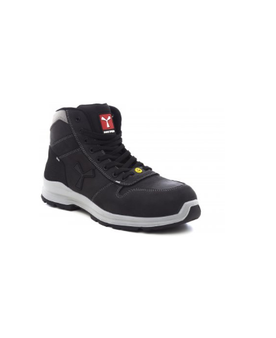 Mittelhoher Herren-Sicherheitsschuh, Obermaterial aus wasserabweisendem und atmungsaktivem Leder, atmungsaktives und abriebfestes Innenfutter (auf der gesamten Innenfläche), 8+8 metallfreie Ösen, Hinterkappe aus Leder mit Pampasstruktur mit reflektierendem Einsatz, Zehenschutzkappe aus druckgegossenem Aluminium, herausnehmbare Einlage Ortholite X40 016 ESD, zertifizierte durchtrittsichere Sohle aus Verbundgewebe, Versteifungselement zum Schutz vor Verdrehungen, hufeisenförmiger Spitzenschutz, Zwischensohle aus federleichtem Polyurethan ESD, Dämpfungssystem MASTER BALANCE aus PU-Polyether von hoher Bruchfestigkeit und ausgewogener Dichte, X-TRAIL-GRIP-Sohle aus TPU ESD mit Fersen- und Zehenschutz