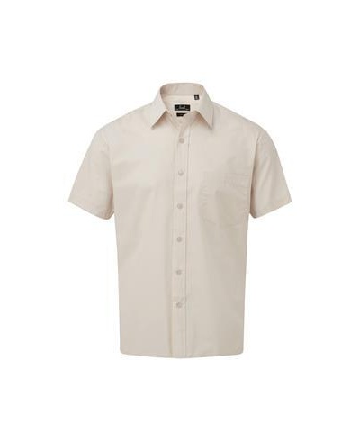Ein kurzärmliges Arbeitshemd für Herren, erhältlich in 27 Farben. Dieses Hemd hat einen versteiften Kragen im formellen Schnitt, der Platz für eine Krawatte bietet, und der Hauptkörper verfügt über eine praktische linke Brusttasche.
