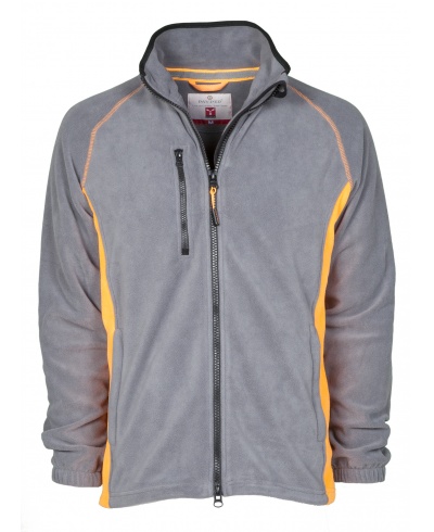 Zweifarbige Herren-Fleecejacke mit durchgehendem, schwarzem 8 mm Reißverschluss aus Kunststoff, Raglanärmeln, regulierbarem Kordelzug in der Taille, elastischen Ärmelbündchen, zwei Taschen mit verdecktem Reißverschluss, einer Vordertasche mit Reißverschluss, Kragen mit verstärktem Rand in Kontrastfarbe, verstärkten Nähten