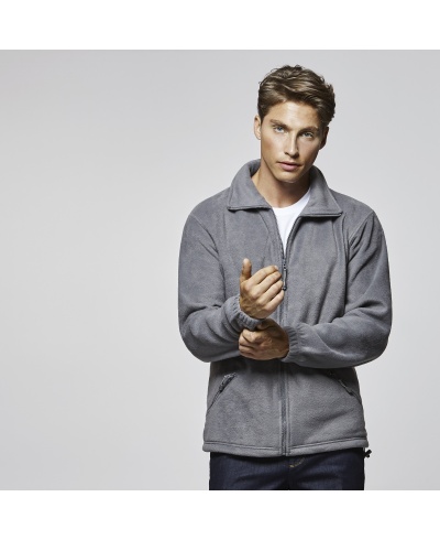 Fleecejacke mit hohem Kragen. Durchgehender Reißverschluss mit Plastikpuller. Seitentaschen mit Reißverschluss, gleichfarbig. Elastische Ärmelbündchen. Elastischer Kordelzug mit Stopper im Saum.