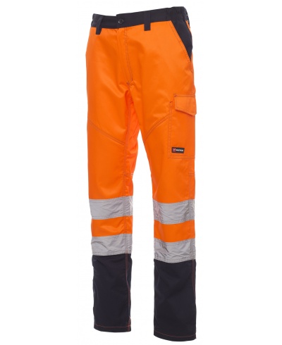 Ganzjährig tragbare, zweifarbige und gut sichtbare Herrenhose mit Reflexstreifen, seitlich dehnbarem Bund und Gürtelschlaufen, Hosenschlitz mit Reißverschluss und Knopf aus Kunststoff, zwei