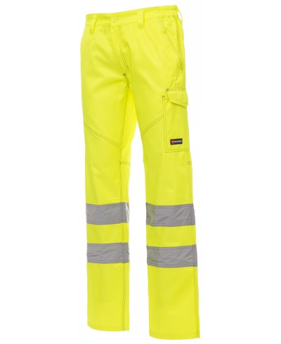 Ganzjährig tragbare, zweifarbige und gut sichtbare Herrenhose mit Reflexstreifen, seitlich dehnbarem Bund und Gürtelschlaufen, Hosenschlitz mit Reißverschluss und Knopf aus Kunststoff, zwei
