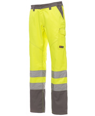 Ganzjährig tragbare, zweifarbige und gut sichtbare Herrenhose mit Reflexstreifen, seitlich dehnbarem Bund und Gürtelschlaufen, Hosenschlitz mit Reißverschluss und Knopf aus Kunststoff, zwei