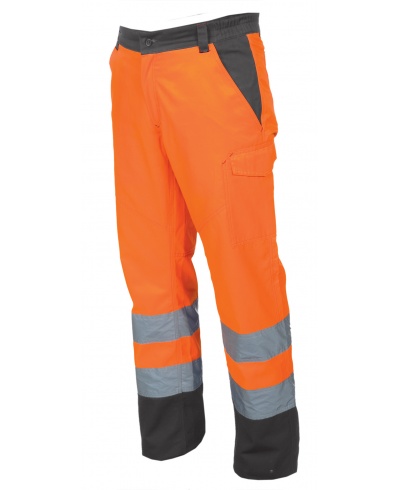 Zweifarbige und gut sichtbare Winter-Herrenhose mit Reflexstreifen, seitlich dehnbarem Bund und Gürtelschlaufen, Hosenschlitz mit Reißverschluss und Knopf aus Kunststoff, zwei klassisch geschnittenen Vordertaschen, einer Seitentasche mit LOCK SYSTEM, Zollstocktasche, einer offenen Gesäßtasche und einer mit Patte und Klettverschluss. Nähte in Kontrastfarbe, Dreifachnähte im Schritt und am Innenbein