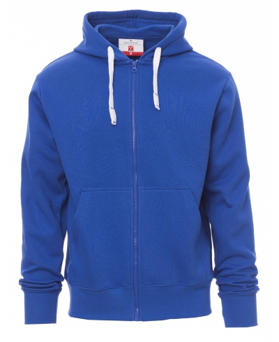 Herren-Sweatshirt, durchgehender Reißverschluss und Kapuze in gleicher Farbe, Bauchtaschen, verstärkte Nähte, Bündchen und Bund aus elastischem Rippenstrick. Gleichfarbiges Verstärkungsband im Kragen