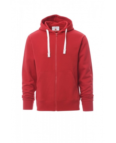 Herren-Sweatshirt, durchgehender Reißverschluss und Kapuze in gleicher Farbe, Bauchtaschen, verstärkte Nähte, Bündchen und Bund aus elastischem Rippenstrick. Gleichfarbiges Verstärkungsband im Kragen