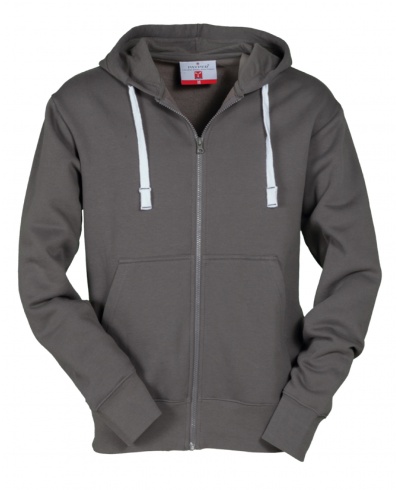 Herren-Sweatshirt, durchgehender Reißverschluss und Kapuze in gleicher Farbe, Bauchtaschen, verstärkte Nähte, Bündchen und Bund aus elastischem Rippenstrick. Gleichfarbiges Verstärkungsband im Kragen