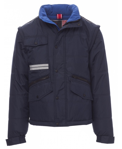 Taillierte Herren-Jacke mit abtrennbaren Ärmeln und Reißverschluss, zwei Außentaschen mit LOCK SYSTEM und zwei mit Reißverschluss, schräg stehenden Taschen, um das Einführen der Hand zu erleichtern, einer Handy-