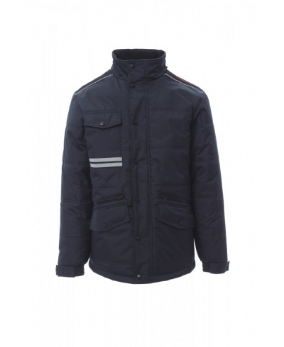 Herren-3/4-Jacke, verdeckter 8 mm Reißverschluss aus Kunststoff mit Metallschieber und Kunststoffknöpfen, abgerundeter Rücken, im Kragen verstaubare Kapuze, 2 Außentaschen mit LOCK SYSTEM und 2 mit Reißverschluss, schräg stehende Taschen, um das Einführen der Hand zu erleichtern, 1 Smartphone-Brusttasche und Ring zum Befestigen des Ausweises, Reflexstreifen auf der Tasche und auf dem Rücken. Innenseite: wattiert, Fleece in Kontrastfarbe auf Rücken und Kragen, 1 Tasche, Innenreißverschluss zum einfacheren Veredeln mit Druck und Stick