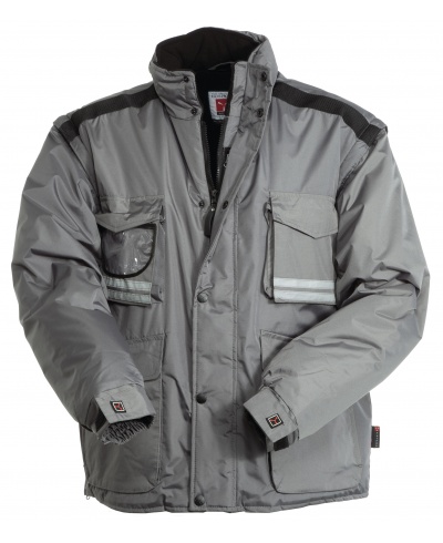 Herren-Jacke, abtrennbare Ärmel, verdeckter 8 mm Reißverschluss aus Kunststoff mit Metallschieber und Kunststoffknöpfen, im Kragen einrollbare Kapuze, regulierbare Ärmelbündchen, Reflexstreifen Ton-in-Ton vorne und hinten, Seitenschlitz mit Ziehharmonikafalte und Reißverschluss, 5 Außentaschen, davon 1 mit nach innen wendbarem Ausweisfach. Innenseite: wattiert, Kragen, Rücken- und Nierenschutz aus Mikrofleece, atmungsaktive Einsätze unter den Armen, Kordelzug in der Taille und Innenreißverschluss zum einfacheren Veredeln mit Druck und Stick