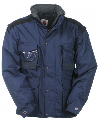 Herren-Jacke, abtrennbare Ärmel, verdeckter 8 mm Reißverschluss aus Kunststoff mit Metallschieber und Kunststoffknöpfen, im Kragen einrollbare Kapuze, regulierbare Ärmelbündchen, Reflexstreifen Ton-in-Ton vorne und hinten, Seitenschlitz mit Ziehharmonikafalte und Reißverschluss, 5 Außentaschen, davon 1 mit nach innen wendbarem Ausweisfach. Innenseite: wattiert, Kragen, Rücken- und Nierenschutz aus Mikrofleece, atmungsaktive Einsätze unter den Armen, Kordelzug in der Taille und Innenreißverschluss zum einfacheren Veredeln mit Druck und Stick
