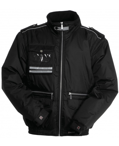 Men’s casual lightweight jacket with detachable sleeves, close fitting, plastic zip with metal pull, foldaway hood, rib hem, adjustable cuffs, shoulder tabs and zip-up collar, two LOCK SYSTEM pockets, two pockets with zip, one reversible badge holder pocket, reflex piping on the shoulders and two reflective stripes on the chest and back. Padded, high-density, silver coloured lining, micro-fleece back, fleece inside collar, one inner pocket