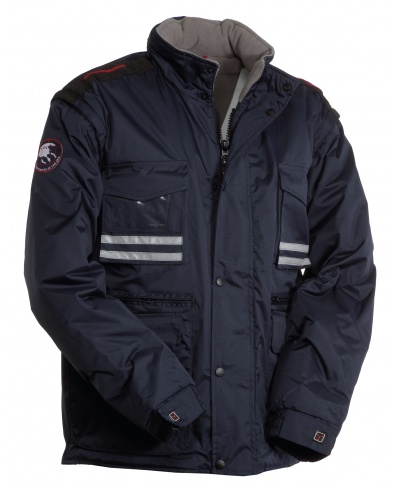 Herren-Jacke mit abtrennbaren Ärmeln, verdecktem 8 mm Reißverschluss aus Kunststoff mit Metallschieber und Kunststoffknöpfen, vorgeformter, abnehmbarer oder im Kragen einrollbarer Kapuze, regulierbaren Ärmelbündchen, grauen Reflexstreifen vorne und hinten, vorgeformten Ellbogen und Seitenschlitz mit Ziehharmonikafalte und Reißverschluss, neun Außentaschen, davon zwei mit LOCK SYSTEM, zwei mit Reißverschluss und verstärkter Innenseite, einer mit nach innen wendbarem Ausweisfach; Innenseite: wattiert, Kragen, Rücken- und Nierenschutz aus Mikrofleece, atmungsaktive Einsätze, Kordelzug in der Taille und Innenreißverschluss