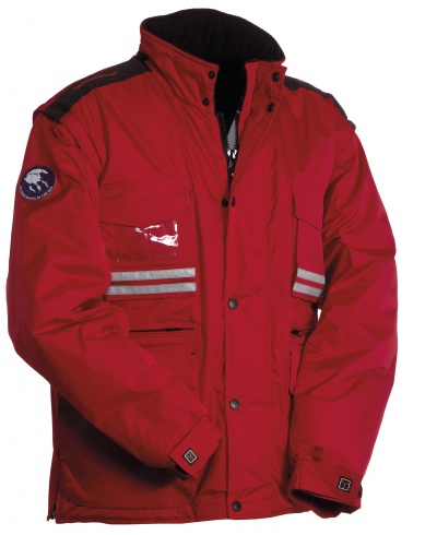 Herren-Jacke mit abtrennbaren Ärmeln, verdecktem 8 mm Reißverschluss aus Kunststoff mit Metallschieber und Kunststoffknöpfen, vorgeformter, abnehmbarer oder im Kragen einrollbarer Kapuze, regulierbaren Ärmelbündchen, grauen Reflexstreifen vorne und hinten, vorgeformten Ellbogen und Seitenschlitz mit Ziehharmonikafalte und Reißverschluss, neun Außentaschen, davon zwei mit LOCK SYSTEM, zwei mit Reißverschluss und verstärkter Innenseite, einer mit nach innen wendbarem Ausweisfach; Innenseite: wattiert, Kragen, Rücken- und Nierenschutz aus Mikrofleece, atmungsaktive Einsätze, Kordelzug in der Taille und Innenreißverschluss