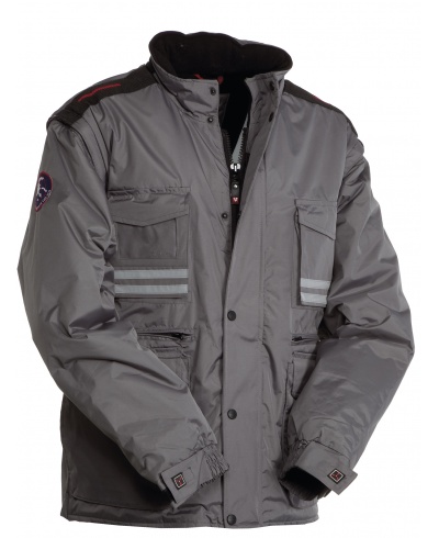 Herren-Jacke mit abtrennbaren Ärmeln, verdecktem 8 mm Reißverschluss aus Kunststoff mit Metallschieber und Kunststoffknöpfen, vorgeformter, abnehmbarer oder im Kragen einrollbarer Kapuze, regulierbaren Ärmelbündchen, grauen Reflexstreifen vorne und hinten, vorgeformten Ellbogen und Seitenschlitz mit Ziehharmonikafalte und Reißverschluss, neun Außentaschen, davon zwei mit LOCK SYSTEM, zwei mit Reißverschluss und verstärkter Innenseite, einer mit nach innen wendbarem Ausweisfach; Innenseite: wattiert, Kragen, Rücken- und Nierenschutz aus Mikrofleece, atmungsaktive Einsätze, Kordelzug in der Taille und Innenreißverschluss