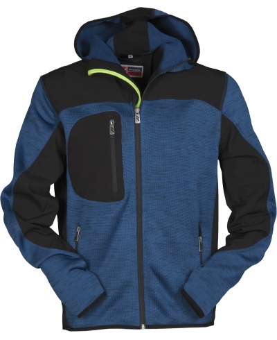 Taillierte Herren-Jacke mit langem versiegeltem SBS-Reißverschluss, vorgeformter Kapuze mit zwei Nähten, feinem Saum an Handgelenk und Taille, zwei Seitentaschen mit Reißverschluss, einer Brusttasche und schwarzen Strick- und Softshell-Einsätzen