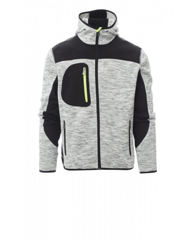 Taillierte Herren-Jacke mit langem versiegeltem SBS-Reißverschluss, vorgeformter Kapuze mit zwei Nähten, feinem Saum an Handgelenk und Taille, zwei Seitentaschen mit Reißverschluss, einer Brusttasche und schwarzen Strick- und Softshell-Einsätzen