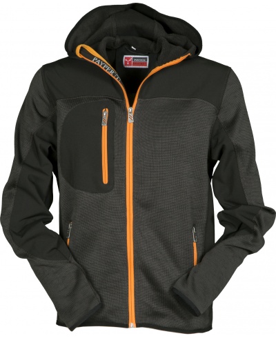 Taillierte Herren-Jacke mit langem versiegeltem SBS-Reißverschluss, vorgeformter Kapuze mit zwei Nähten, feinem Saum an Handgelenk und Taille, zwei Seitentaschen mit Reißverschluss, einer Brusttasche und schwarzen Strick- und Softshell-Einsätzen