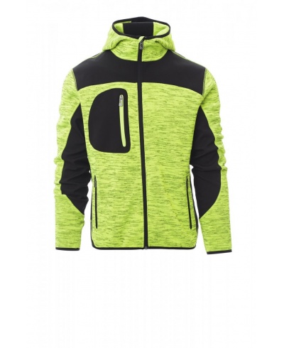 Taillierte Herren-Jacke mit langem versiegeltem SBS-Reißverschluss, vorgeformter Kapuze mit zwei Nähten, feinem Saum an Handgelenk und Taille, zwei Seitentaschen mit Reißverschluss, einer Brusttasche und schwarzen Strick- und Softshell-Einsätzen
