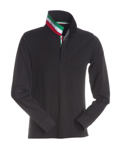 Langärmeliges Herren-Poloshirt mit 3, dazu passenden Perlmutt-Effektknöpfen, passendem Kragen, mit kontrastierender Unterseite (Farben der Flagge). Innere Knopfleiste und Seitenschlitze mit Farben der Flagge, Rippkragen und Ärmelabschluss, verdeckte Kragensteppung, Seitenverstärkungsband, Nackenband innen