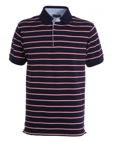 Striped, short-sleeved polo shirt with 3 white buttons, button flap, inside collar and side vents in Oxford blue, rib collar and sleeve edging.
