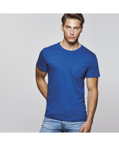 Kurzärmeliges T-Shirt mit Brusttasche. Seitennähte. Vierlagiger Kragen. Durchgehendes Nackenband.