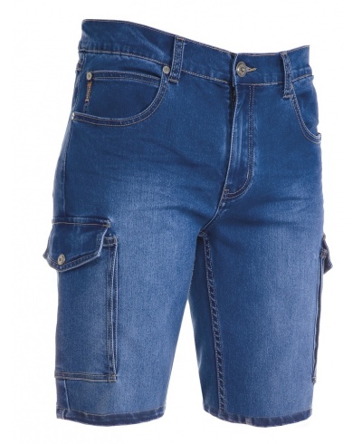 Herren-Bermudas im Jeans-Design mit fünf Taschen, zwei Seitentaschen mit LOCK SYSTEM mit leichter Ziehharmonikafalte, Hosenschlitz mit Metallreißverschluss und Knopf, Gürtelschlaufen, stone-washed für einen Used Look und Délavé-Effekt, mit kontrastfarbigen dickfädigen Nähten, Doppelnaht am Innenbein, Nieten und Patch aus echtem Leder
