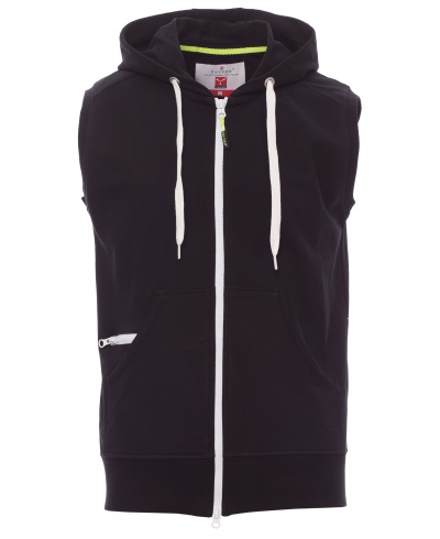 Ärmelloser Kapuzenpullover für Männer, vollplastischer Reißverschluss in Kontrastfarbe mit doppeltem Metallzug, Kapuze und Kordelzug in Kontrastfarbe, Kängurutasche mit kleiner Reißverschlusstasche