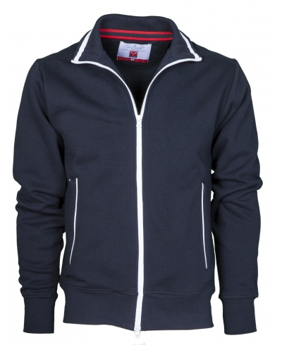 Herren-Sweatjacke mit durchgehendem 2-Wege-SBS-Reißverschluss aus Kunststoff in Kontrastfarbe mit Metallschieber, kontrastfarbiger Einfassung auf dem Rippstrickkragen und auf den Seitentaschen, Kugelärmeln, zwei Außentaschen mit Reißverschlüssen in Kontrastfarbe, elastischem Feinripp an Ärmeln und Taille, verstärkten Nähten