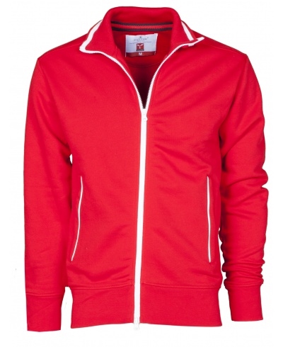 Herren-Sweatjacke mit durchgehendem 2-Wege-SBS-Reißverschluss aus Kunststoff in Kontrastfarbe mit Metallschieber, kontrastfarbiger Einfassung auf dem Rippstrickkragen und auf den Seitentaschen, Kugelärmeln, zwei Außentaschen mit Reißverschlüssen in Kontrastfarbe, elastischem Feinripp an Ärmeln und Taille, verstärkten Nähten