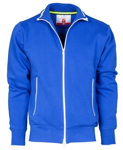 Herren-Sweatjacke mit durchgehendem 2-Wege-SBS-Reißverschluss aus Kunststoff in Kontrastfarbe mit Metallschieber, kontrastfarbiger Einfassung auf dem Rippstrickkragen und auf den Seitentaschen, Kugelärmeln, zwei Außentaschen mit Reißverschlüssen in Kontrastfarbe, elastischem Feinripp an Ärmeln und Taille, verstärkten Nähten