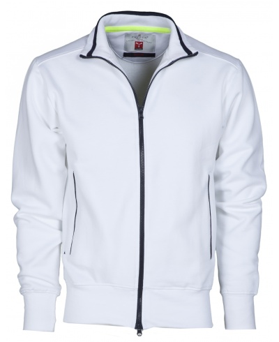 Herren-Sweatjacke mit durchgehendem 2-Wege-SBS-Reißverschluss aus Kunststoff in Kontrastfarbe mit Metallschieber, kontrastfarbiger Einfassung auf dem Rippstrickkragen und auf den Seitentaschen, Kugelärmeln, zwei Außentaschen mit Reißverschlüssen in Kontrastfarbe, elastischem Feinripp an Ärmeln und Taille, verstärkten Nähten