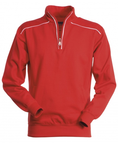 Sweatshirt mit kurzem gleichfarbigem Reißverschluss aus Kunststoff mit Metallschieber, kontrastfarbiger Einfassung an den Schultern, am Reißverschlussrand und auf dem Rücken, zwei Reißverschlusstaschen, elastischem Feinripp an Ärmeln und Taille