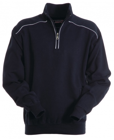 Sweatshirt mit kurzem gleichfarbigem Reißverschluss aus Kunststoff mit Metallschieber, kontrastfarbiger Einfassung an den Schultern, am Reißverschlussrand und auf dem Rücken, zwei Reißverschlusstaschen, elastischem Feinripp an Ärmeln und Taille