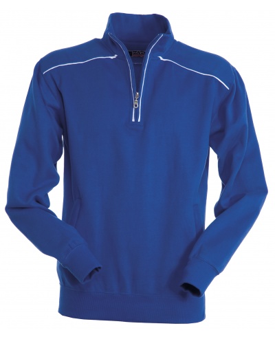 Sweatshirt mit kurzem gleichfarbigem Reißverschluss aus Kunststoff mit Metallschieber, kontrastfarbiger Einfassung an den Schultern, am Reißverschlussrand und auf dem Rücken, zwei Reißverschlusstaschen, elastischem Feinripp an Ärmeln und Taille
