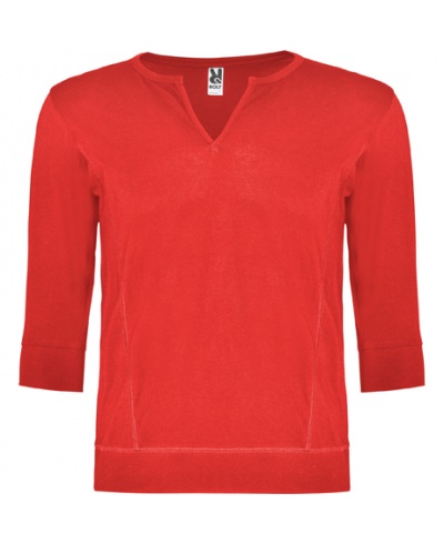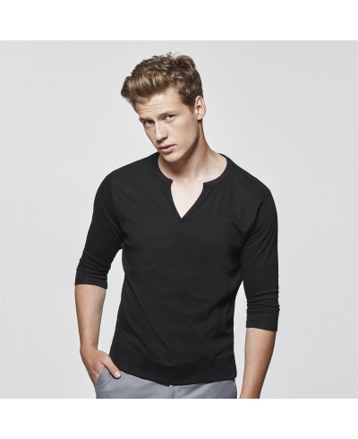 Herren T-Shirt mit ¾ Arm, mit weitem, eingefassten Rundkragen und V-Einschnitt. Seiteneinsätze mit Ziernaht. Breite, elastistische Saum- und Ärmelbündchen.