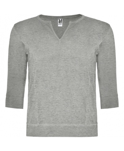 Herren T-Shirt mit ¾ Arm, mit weitem, eingefassten Rundkragen und V-Einschnitt. Seiteneinsätze mit Ziernaht. Breite, elastistische Saum- und Ärmelbündchen.