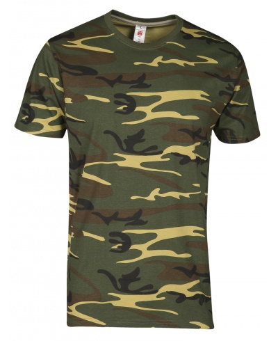 Herren-T-Shirt mit Rundhalsausschnitt, kurzärmelig, Feinripp-Kragen 1,5 cm aus Spandex-Mischgewebe mit Kappnaht an der Vorderseite, Verstärkungsband in Kontrastfarbe von Schulter zu Schulter, das im Kragen sichtbar ist, Stretchnähten, Rundstrick (Tarnfarbe mit Seitennaht)