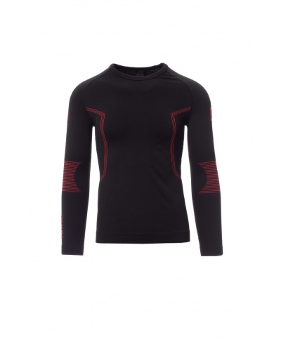 Herren-Thermoshirt, Rundhalsausschnitt, lange Raglanärmel. Weicher und elastischer Stoff mit besonderer Gewebestruktur im Brust- und Rückenbereich, korrekte Transpiration und konstante Wärmeregulierung durch die seitliche besondere Gewebestruktur mit Propellermotiv. Für einen guten Tragekomfort Einfassung an Hals, Taille und Ärmeln aus Feinripp im gleichen Material. Taillierter Rundstrick und Flexzone an den Ellbogen für eine perfekte Anpassung an die Körperkonturen