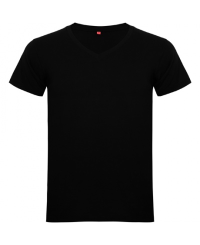 Kurzarm T-Shirt. Tiefer, eingefasster V-Ausschnitt. Nackenband. Seitennähte durch 4 Faden-Overlock Verarbeitung verstärkt.