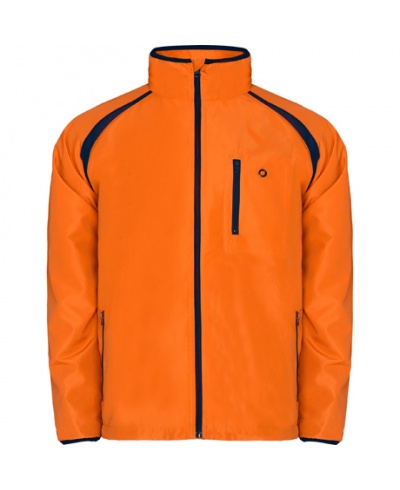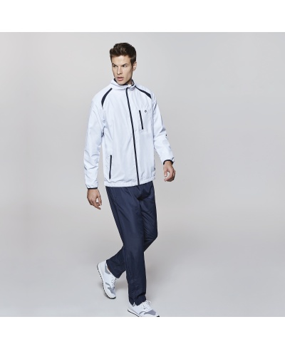 Herren Trainingsanzug. Jacke - Kontrastfarben bei durchgehendem Reißverschluss mit Kinnschutz, bei Reißverschlüssen der Seitentaschen und der linken Brusttasche mit Öse für Kopfhörerkabel und bei den Stoffeinsätzen an den Ärmeln und Ärmelbündchen. Netzinnenfutter. Gummiband im Saum mit Feststeller.