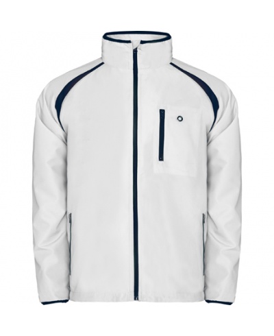 Herren Trainingsanzug. Jacke - Kontrastfarben bei durchgehendem Reißverschluss mit Kinnschutz, bei Reißverschlüssen der Seitentaschen und der linken Brusttasche mit Öse für Kopfhörerkabel und bei den Stoffeinsätzen an den Ärmeln und Ärmelbündchen. Netzinnenfutter. Gummiband im Saum mit Feststeller.