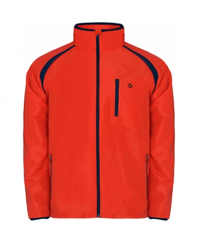 Herren Trainingsanzug. Jacke - Kontrastfarben bei durchgehendem Reißverschluss mit Kinnschutz, bei Reißverschlüssen der Seitentaschen und der linken Brusttasche mit Öse für Kopfhörerkabel und bei den Stoffeinsätzen an den Ärmeln und Ärmelbündchen. Netzinnenfutter. Gummiband im Saum mit Feststeller.