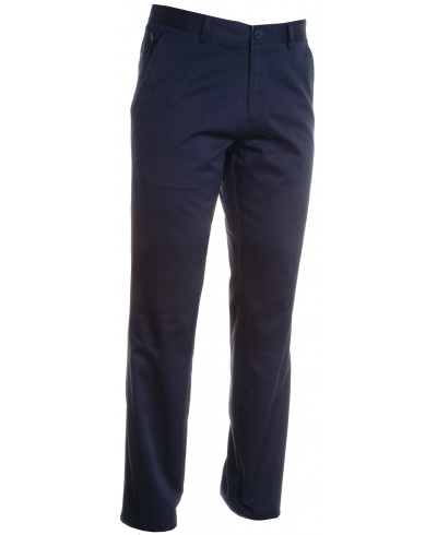 Men’s classic all season trousers with zip fastening with button, belt loops at waist, French pockets, and small pocket with zip, two inset pockets on back with button and patch in real leather, in combed high density two ply cotton enzyme wash