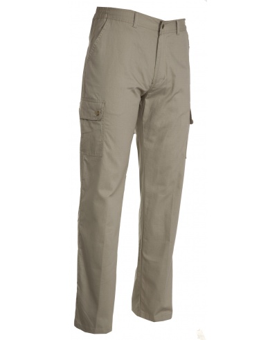Sommer-Herrenhose mit seitlich dehnbarem Bund und Gürtelschlaufen, Hosenschlitz mit Metallreißverschluss und -knopf, zwei klassisch geschnittenen Vordertaschen, zwei Seitentaschen mit Patte und Druckknöpfen, einer Reißverschlusstasche links, einer Einstecktasche für den Zollstock rechts, zwei Gesäß-Leistentaschen mit Knopf und Knopfloch