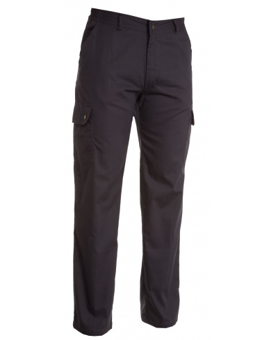 Sommer-Herrenhose mit seitlich dehnbarem Bund und Gürtelschlaufen, Hosenschlitz mit Metallreißverschluss und -knopf, zwei klassisch geschnittenen Vordertaschen, zwei Seitentaschen mit Patte und Druckknöpfen, einer Reißverschlusstasche links, einer Einstecktasche für den Zollstock rechts, zwei Gesäß-Leistentaschen mit Knopf und Knopfloch